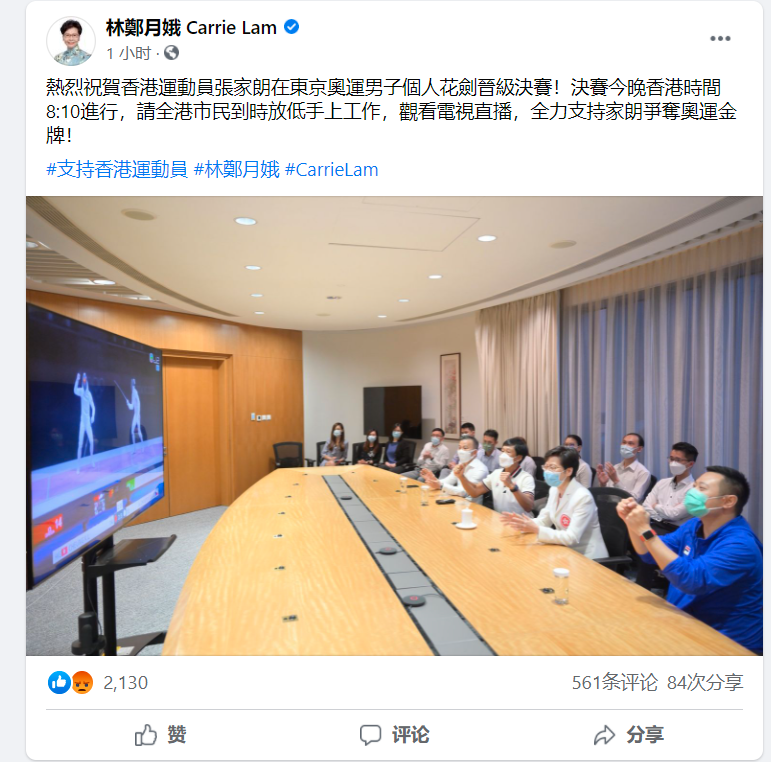 在决赛前,港府行政长官林郑月娥在网上发文呼吁香港市民收看直播,为张家朗加油。她也和港府人员一起收看了直播,见证了香港夺金的时刻。