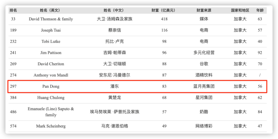 不过这并不影响“蓝月亮”实控人——加拿大籍的潘东及其丈夫罗秋平以558.7亿元财富排在加拿大富豪榜的第7位。