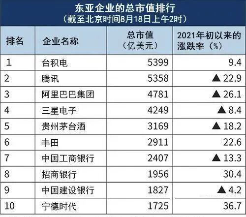 2021年8月21日,台积电的市值为5607亿美元,是亚洲市值最高的公司。在前十名的榜单里,腾讯第二,阿里第三,除了韩国的三星和日本的丰田,全部都是中国的公司。