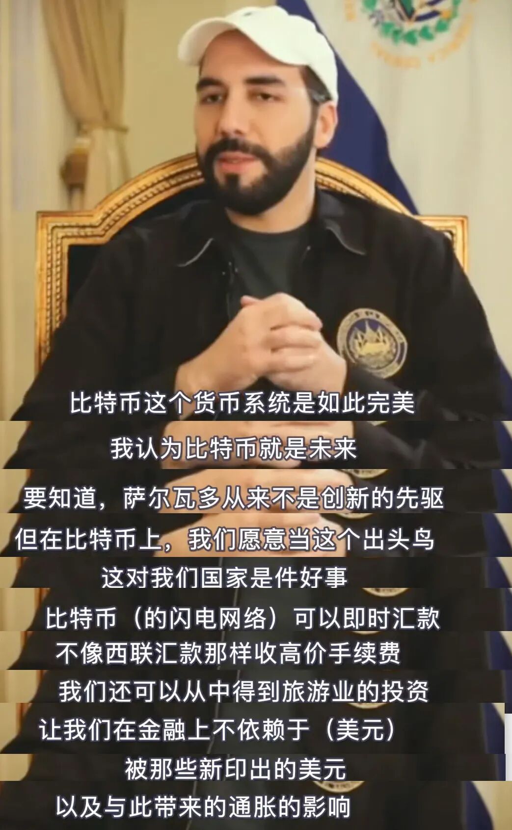 他戴着鸭舌帽、穿着黑夹克、牛仔裤,在社交媒体向国民们解释比特币合法化的必要性和好处。