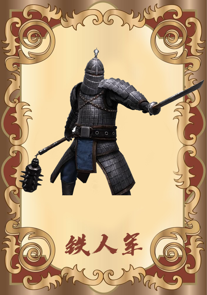 这支铁人军,挑选强壮的士兵组成,全身披挂重甲,只露出眼耳口鼻,刀箭都刺不透,手持斩马大刀,冲锋的时候后面拉一条线,谁要是退到线外立即斩首,因此勇猛无比。