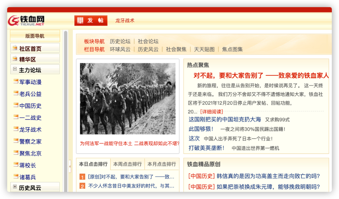 2021年12月20日,中国排名第一的军事论坛铁血网,在社区首页发布了一封“告别信”。