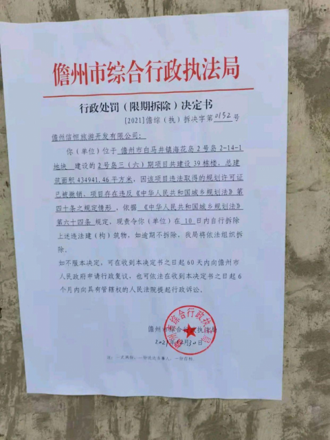 这份行政处罚书上说:“海花岛2号岛三(六)期项目共建设39栋楼,总建筑面积434941.46平方米,因违法取得的规划许可证已被撤销、项目存在违反《中华人民共和国城乡规划法》第四十条之规定情形,依据规定,现责令该公司在10日内自行拆除上述违法建筑物。如逾期不拆除,执法局将依法组织拆除。”