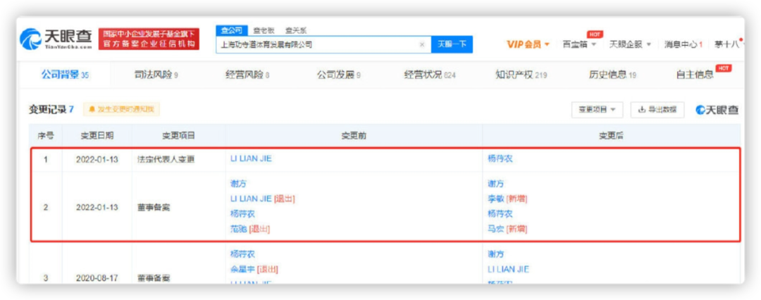 不过几年过去,很多事情都被改变。在“功守道体育”最新的变更信息中,法定代表人已经由LI LIAN JIE变更为杨荇农,同时LI LIAN JIE等人退出董事职位。