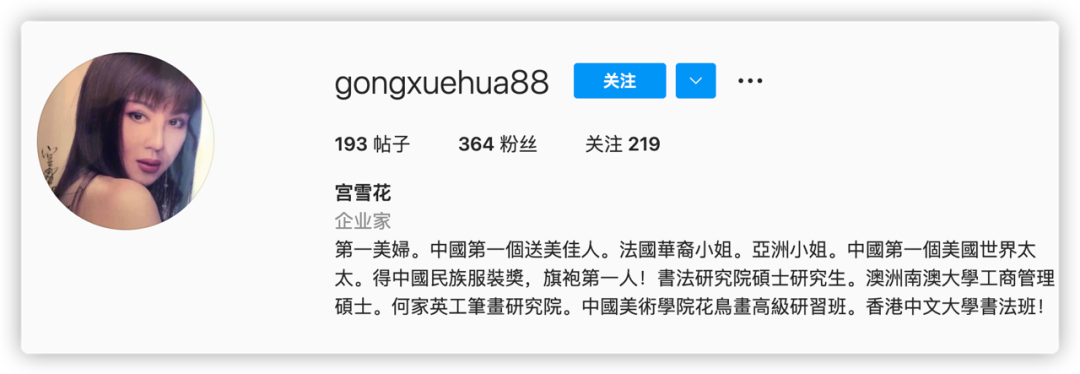在她的个人主页简介里,写着:第一美妇。大陆第一个送美佳人。法国华裔小姐。亚洲小姐。大陆第一个美国世界太太。得中国民族服装奖,旗袍第一人…… 洋洋洒洒囊括了她这一生的精彩。