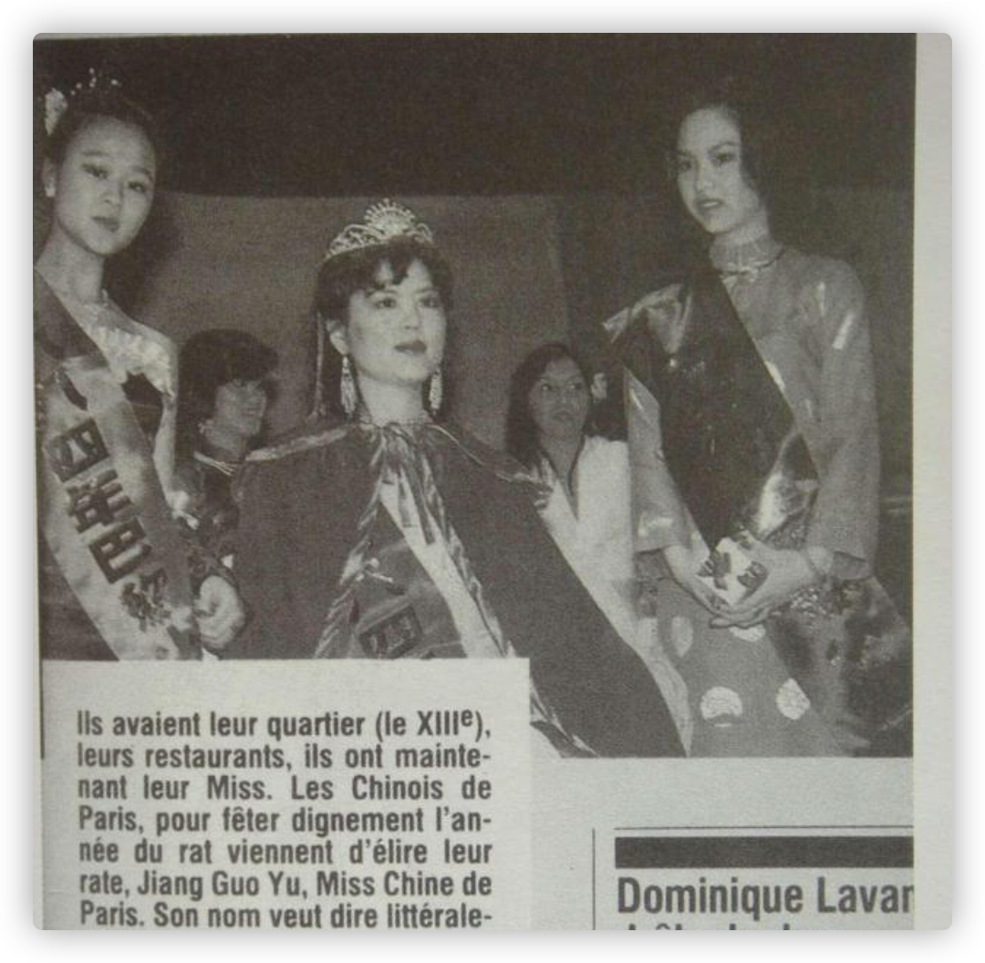 比赛结束后的第二天,她头戴后冠,身披锦带,明眸皓齿,顾盼生姿的照片就刊登在了法国的报纸上,一时间在这座美丽之都造成轰动。她还被一家奢侈品店聘为导购员,一时间门店客流如潮,大家都争相一睹这位华裔小姐的芳容。