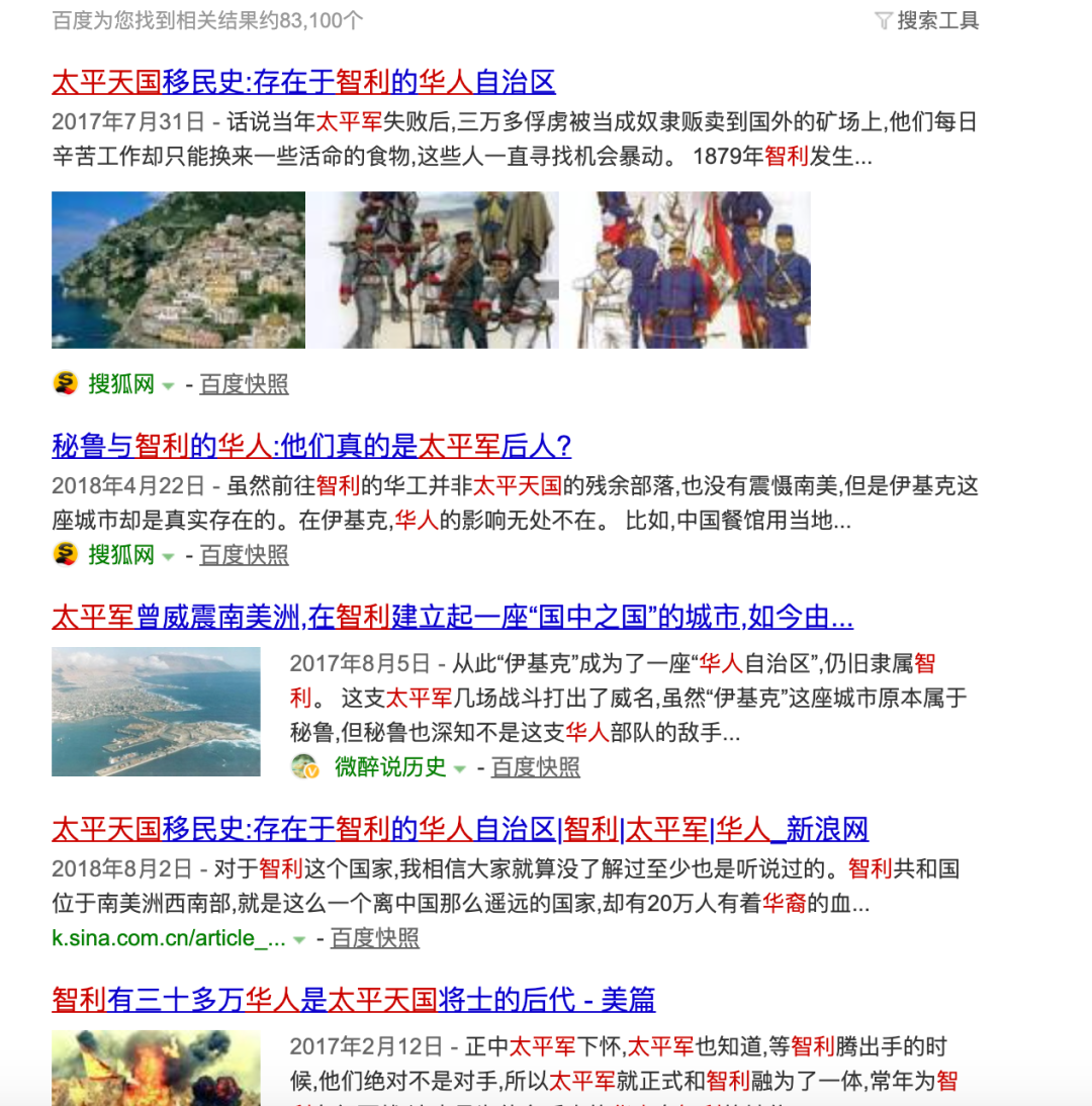 第三是因为“硝石战争”确有几十个中国人加入了智利军队。我估计捏造这个故事的人一定是从这里找到的灵感,再联系上当时中国同时期的“太平天国”运动,张冠李戴,牵强附会而成。