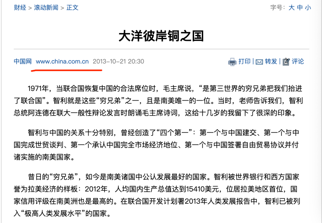 搜索关键词出来的信息,光是“百度”收录的相关事件网页就有83100个,相关资讯2230篇,而最早的一篇时间为2013年10月21日,由“中国网”收录,标题为《大洋彼岸铜之国》,里面由这样一段: