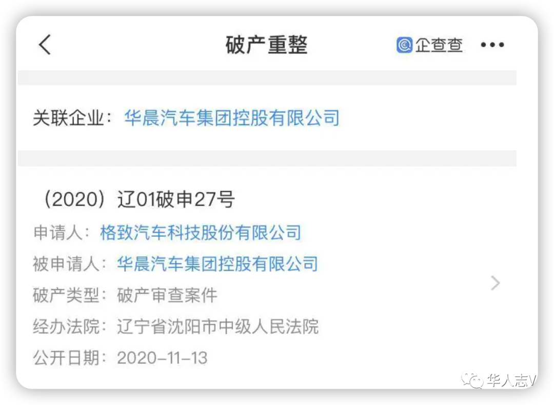 2020年11月20日,沈阳市中级人民法院裁定受理债权人对华晨汽车集团控股有限公司重整申请,标志着这家车企正式进入破产重整程序。