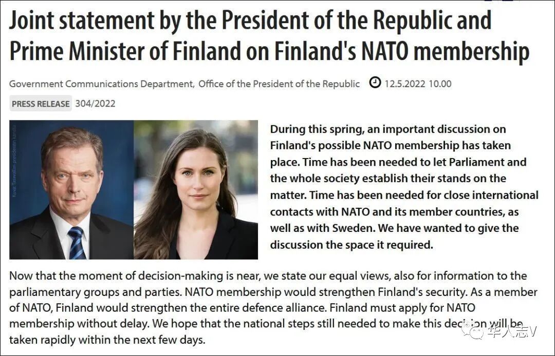 5月12日,芬兰的总统和总理发表了联合声明,宣布支持芬兰申请加入北约,并尽快将有关决定提交议会批准。紧跟芬兰的还有另一个“永久中立国”瑞典,该国的执政党社会民主党也在近日宣称,将于5月15日就该国是否申请加入北约作出决定。