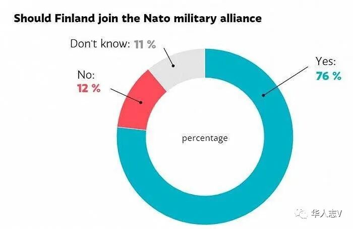 芬兰广播公司民调显示,俄乌战争刚开始时,芬兰有53%的受访者支持该国加入北约,创下历史新高;3月涨至62%。到5月初,支持入北约的占比已经进一步升至76%,仅有12%的受访者反对加入北约。