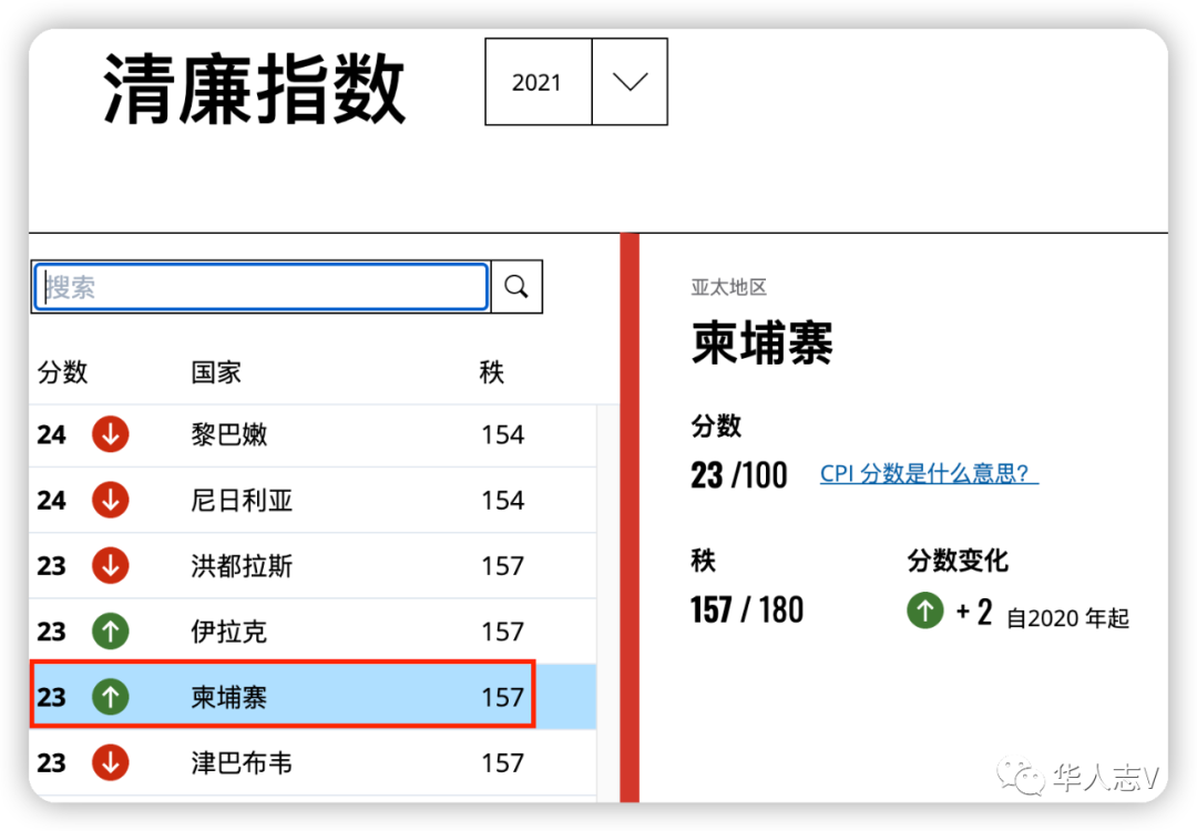 根据透明国际组织(Transparency International)发布2021年全球清廉指数(Corruption Perceptions Index),柬埔寨在180个国家和地区中,排名第157位,满分100评分只获得23分。