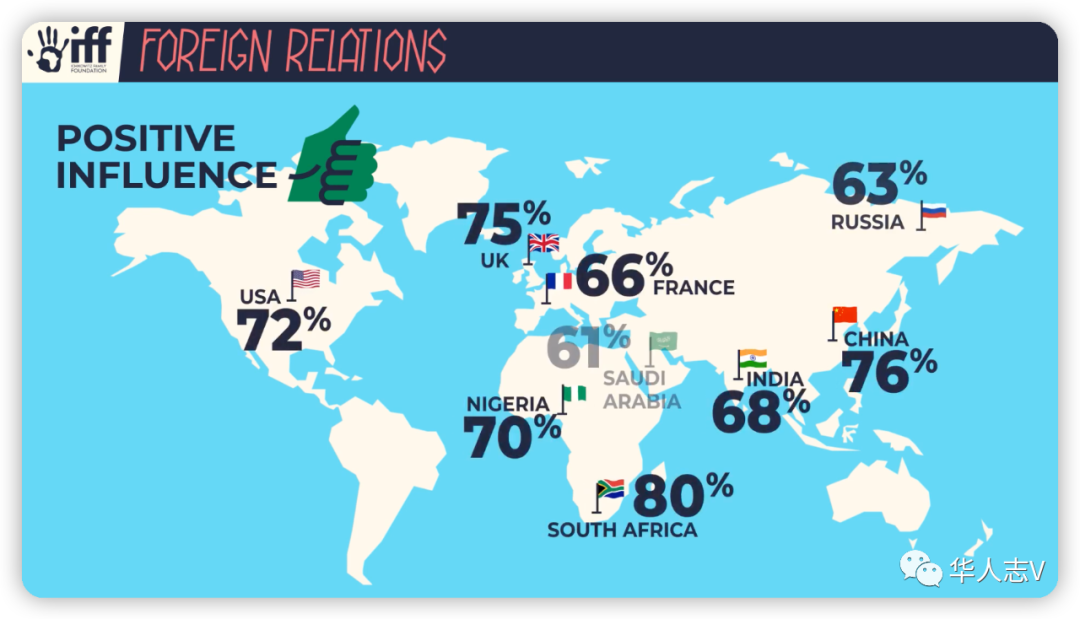 最新民调显示,中国已超越美国,成为非洲年轻人心目中正面影响力最大的非洲之外的国家。 2022年6月13日,由南非伊奇科维茨家庭基金会(Ichikowitz Family Foundation)公布的调查显示:76%年龄介于18岁至24岁的非洲年轻人,将中国视为对他们的生活产生积极影响的境外国家之一,认为是美国的年轻人仅占72%。