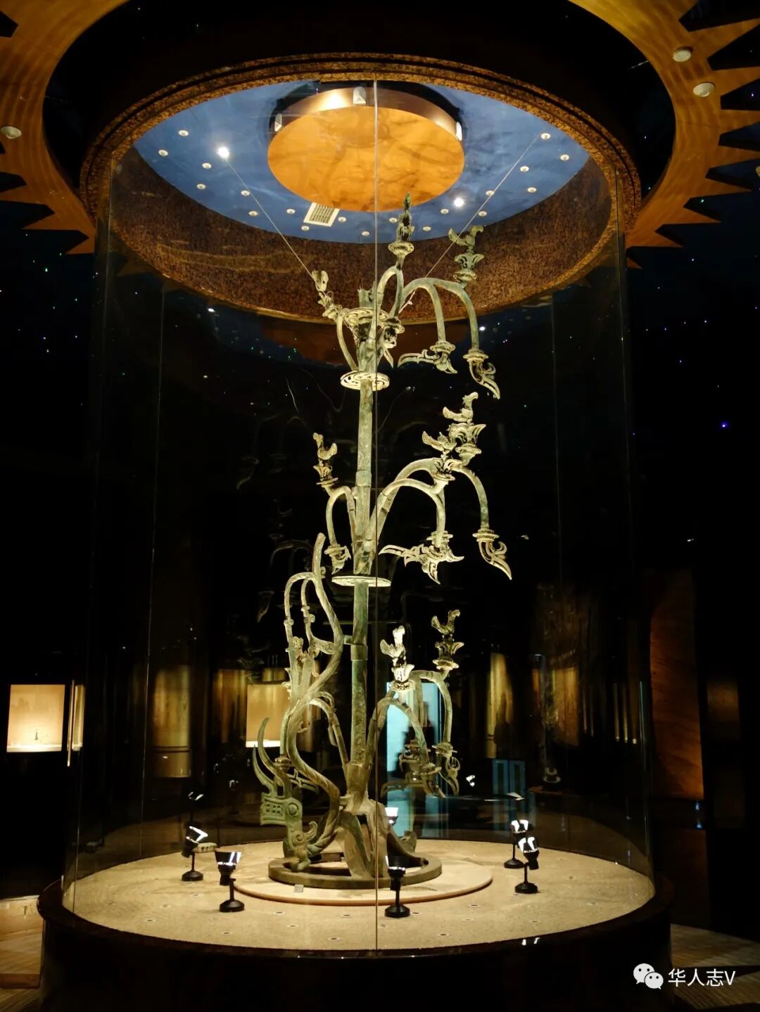 这座文物3.95米高,上面的枝条分出许多枝条,共有27棵三足树,神鸟立于其上,与《山海经》中所描述的扶桑树极为相似。