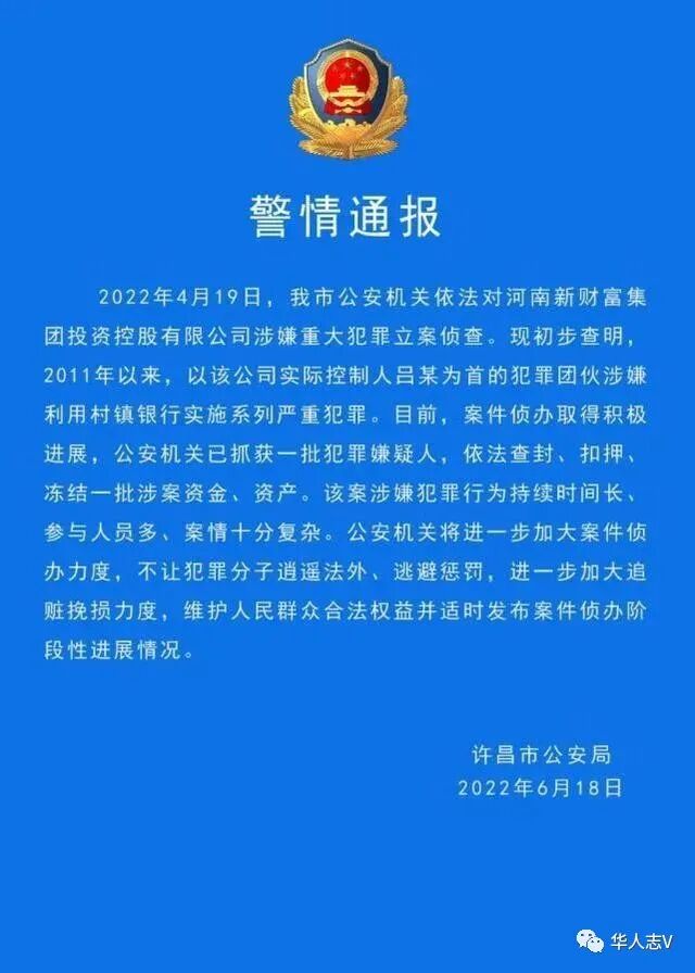 6月18日,许昌市公安局发布通报称,已初步查明,2011年以来,以河南新财富集团实际控制人吕某为首的犯罪团伙涉嫌利用村镇银行实施系列严重犯罪。公安机关已抓获一批犯罪嫌疑人,依法查封、扣押、冻结一批涉案资金、资产。