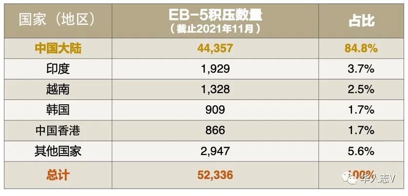 截至2021年11月,美国移民局总共积压了52366件投资移民的申请,其中来自中国大陆地区的就有44357件,占到总人数的84.8%。也就是说,有44357个中国人交了至少50万美元(最近两年涨价到90万美元),正在排队等着,而这笔钱,很有可能已经交了5、6年了。