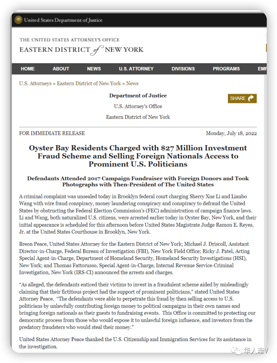 当地时间7月18日,美国联邦司法部发表了一份声明:指控李雪(Sherry Xue Li,音译)和王连波(Lianbo Wang,音译)共谋电汇欺诈、洗钱等罪名,他们通过虚假的投资移民项目,诈骗了超过150名中国人共2700万美元,用于个人挥霍,也使得这150名中国人绿卡梦破灭。而设下骗局的李雪和王连波也在18日上午,在纽约的家中被FBI逮捕。