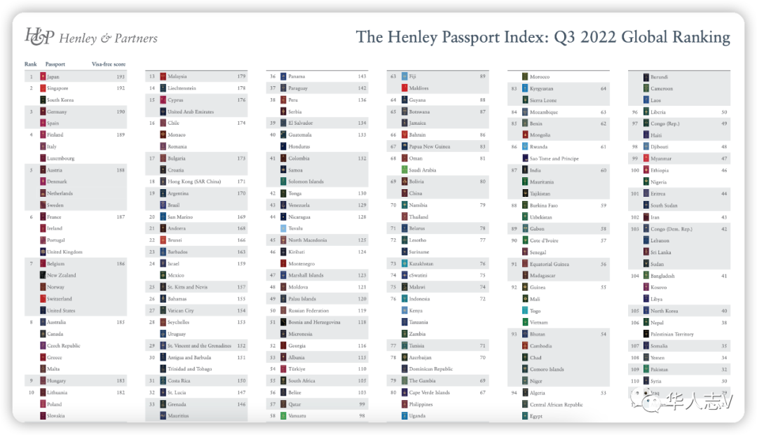 2022年7月20日,英国咨询公司Henley & Partners发布了2022年第二季度全球护照含金量排行榜。这份榜单是根据各国海关的实际政策统计,以免签数量来评估一本护照的出行自由度与含金量。