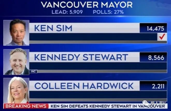 中国移民沈观健以85732票,49%的支持率,击败了上届市长斯图尔特,成功当选。