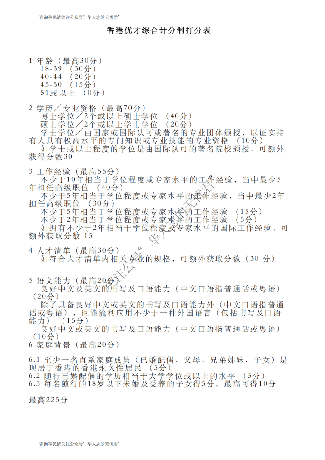 这里推荐香港优秀人才入境计划来获取香港身份。这里也直接上“香港优才“的打分表吧,达到80就有申请资格。