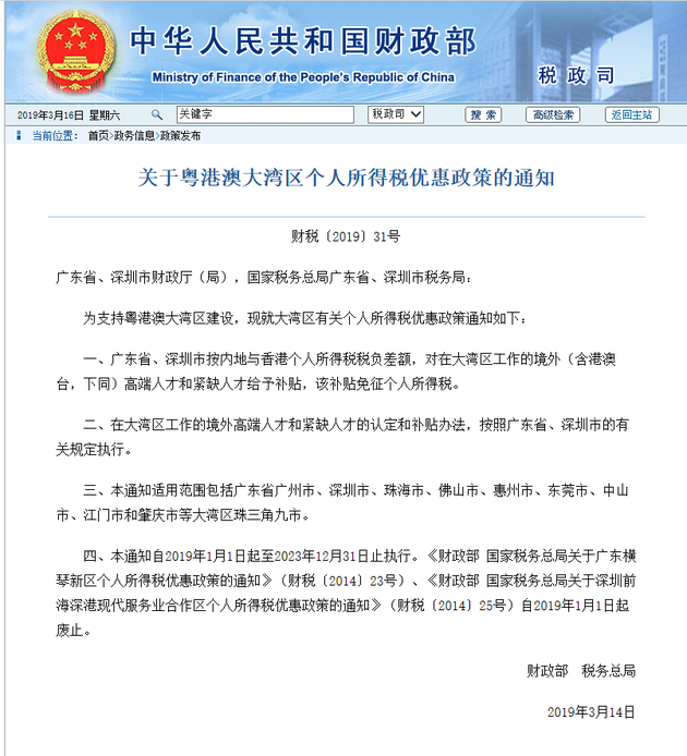 2019年6月,国家出台了《关于粤港澳大湾区个人所得税优惠政策的通知》,里面规定,对在大湾区工作的境外高端人才和紧缺人才,其在珠三角九市缴纳的个人所得税已缴税额超过其按应纳税所得额的15%计算的税额部分,由珠三角九市人民政府给予财政补贴,该补贴免征个人所得税。