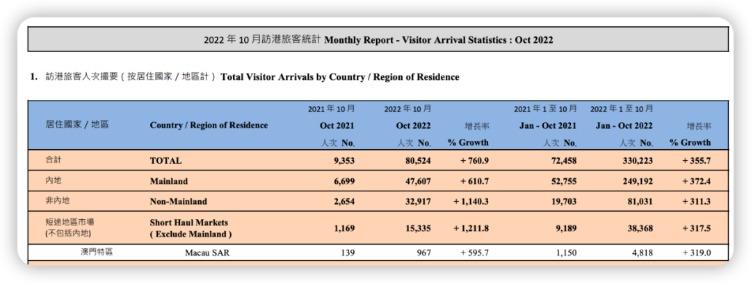 而在2022年1月到2022年10月十个月的时间里,到港游客总共有330223人,同比去年的72458人增长了355.7%。