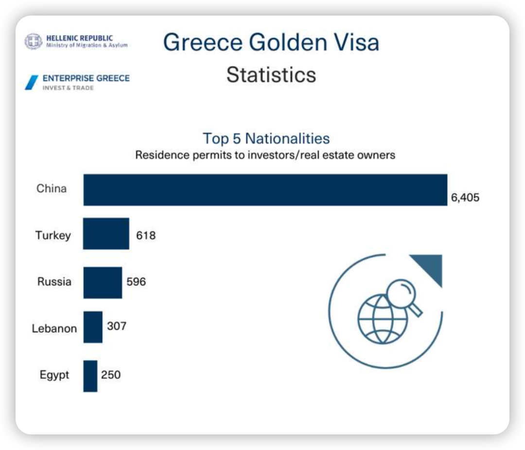 根据希腊移民局公布的数据,从希腊“购房移民”计划开始实施至2021年12月31日,希腊累计向9610个投资者家庭发放了28767份投资签证。其中向6405个中国投资者发放了19412份,是所有申请国家中签证发放数量最多的,占比高达67.5%。