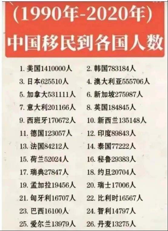 最近我看到一张图,叫做“1990年至2020年中国移民到世界各国的人数”,里面详细列举了30年来中国人移民最多的国家排名和具体的人数。
