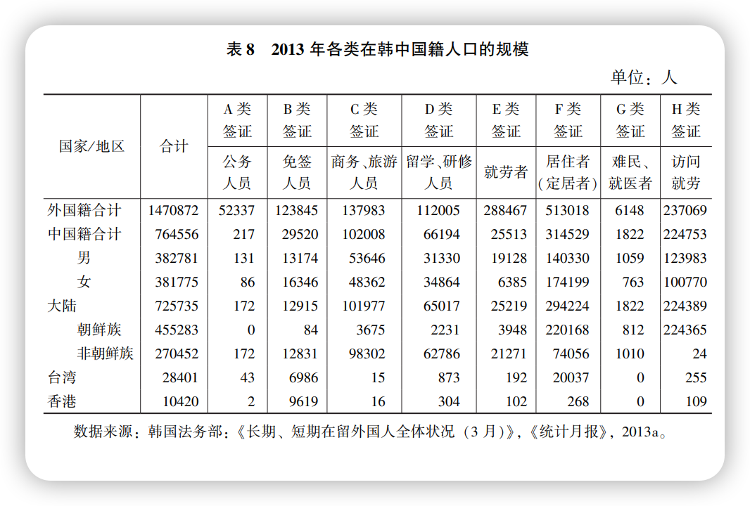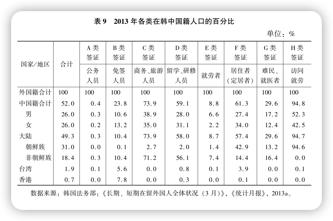 根据韩国法务部2013年3月发布的统计月报,当时在韩国的中国移民中,来自大陆的有72.6万人口, 朝鲜族达45.5万人, 占全体的63%,特别是“访问就劳者”和“居住者”这两个群体, 由于韩国政府在外劳引进和永住权审查制度上“同胞优先”政策的影响, 朝鲜族分别占了几乎全部和大多数。