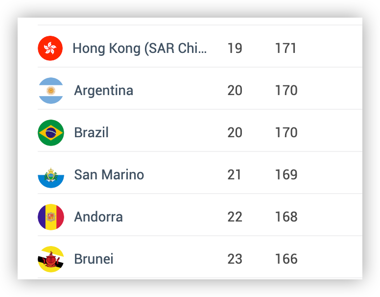 中国香港特区护照的表现依然很抢眼,以免签数171排名全球第19位,基本可以免签欧美很多发达国家,这也是香港身份最重要的吸引力之一了。