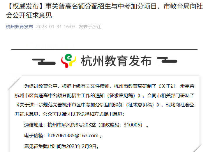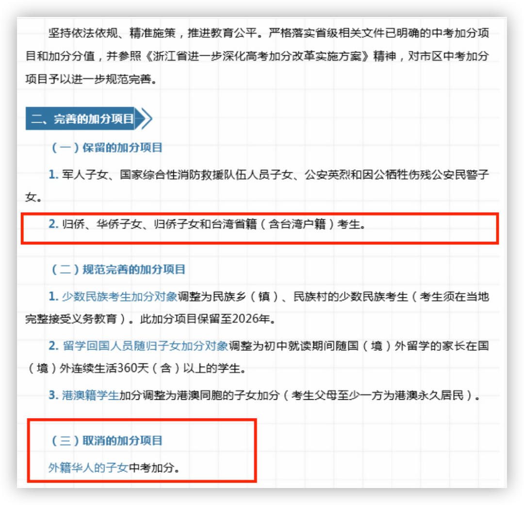 2023年1月31日,杭州市教育局发布《关于进一步完善杭州市区普通高中名额分配招生工作的通知》,其中,最值得注意的是“取消的加分项目”。根据征求意见稿,此次取消的加分项目是“外籍华人子女中考的加分”。