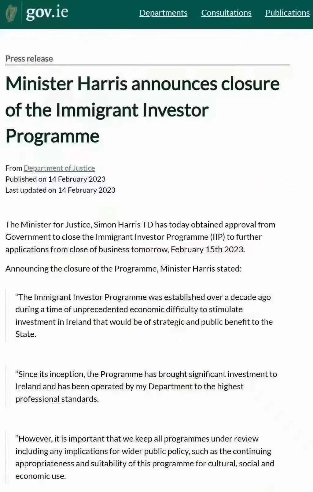 当地时间2023年2月14日,爱尔兰司法部部长哈里斯宣布:关停爱尔兰投资移民计划,包括投资100万欧元购买基金和捐赠40万欧元的项目。