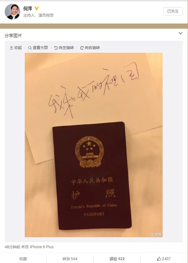 舆论逼着倪萍出来澄清,称自己只是“玩笑开过了”,并晒出自己的中国护照,再手写了一行字:“我和我的祖国”。