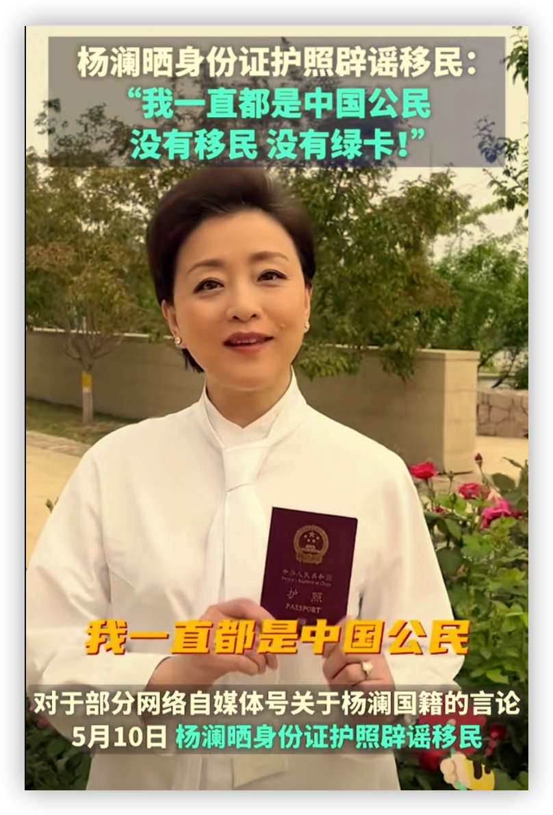 著名媒体人、企业家杨澜最近拍了个视频,用晒出自己护照和身份证的方式,来回击那些关于自己已经移民的谣言。