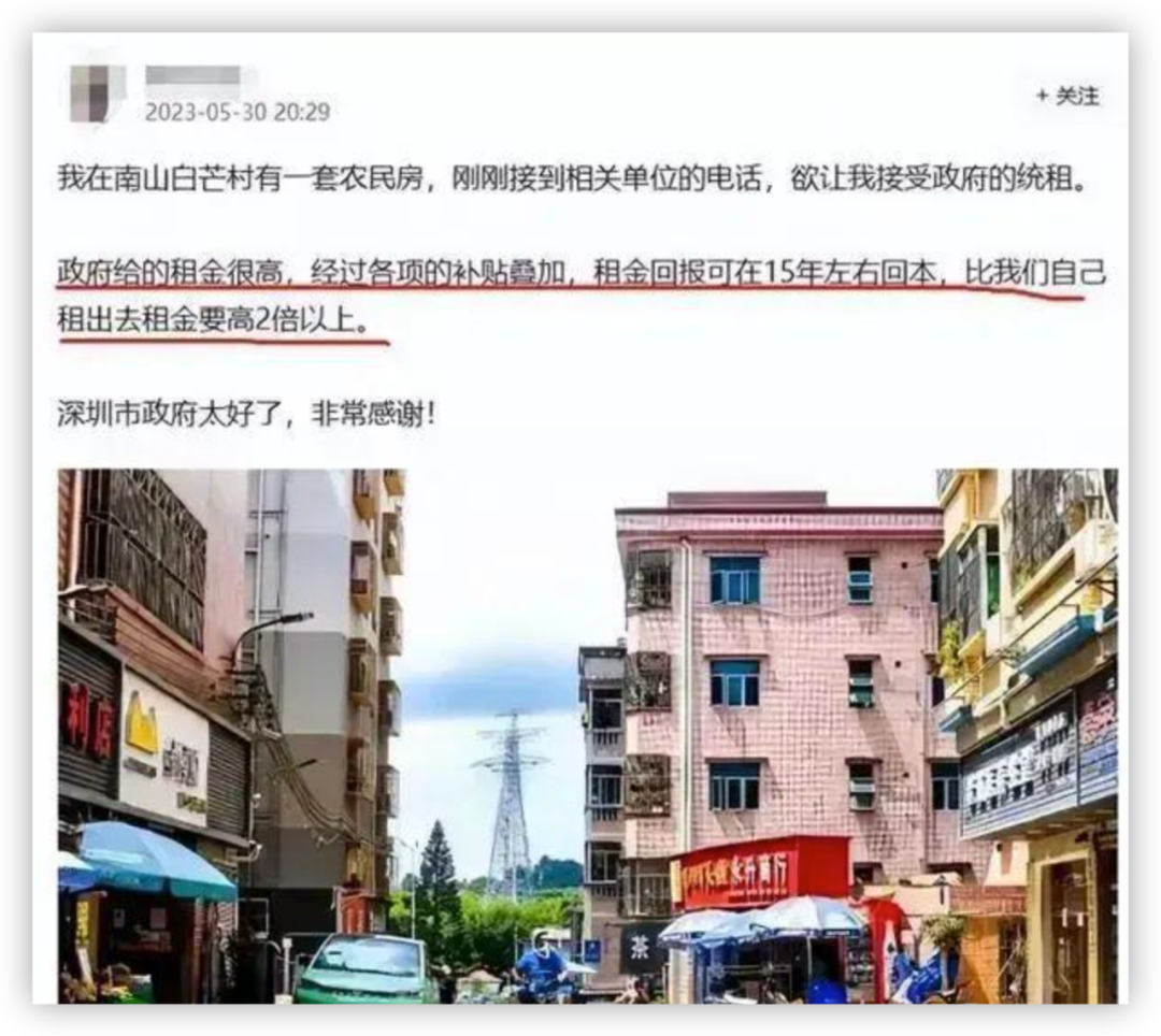 从2023年5月27日开始,深圳市政府出面与白芒村的房东们签约,一般都签订10年以上的长租协议,升级改造之后再进行出租,部分可纳入政策性保障房体系。
