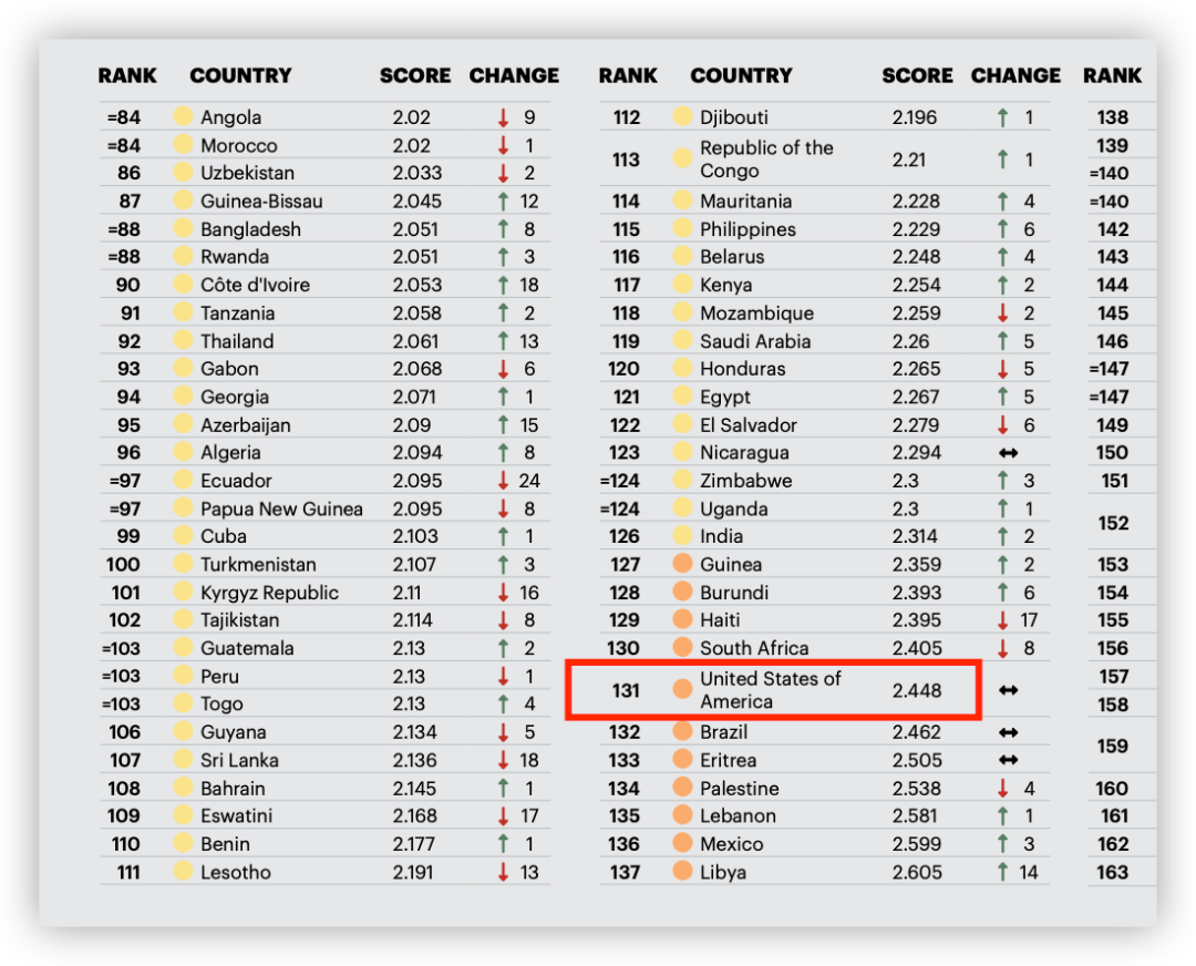 真正的传统大国和平指数反而比不过这些国家,比如美国,尽管还是世界第一强国,但美国和平指数排名全球第131位,总共才163个国家和地区上榜。