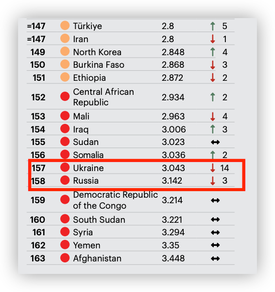 除了俄罗斯和乌克兰是因为战争,其余都是长期以来排名倒数的国家。