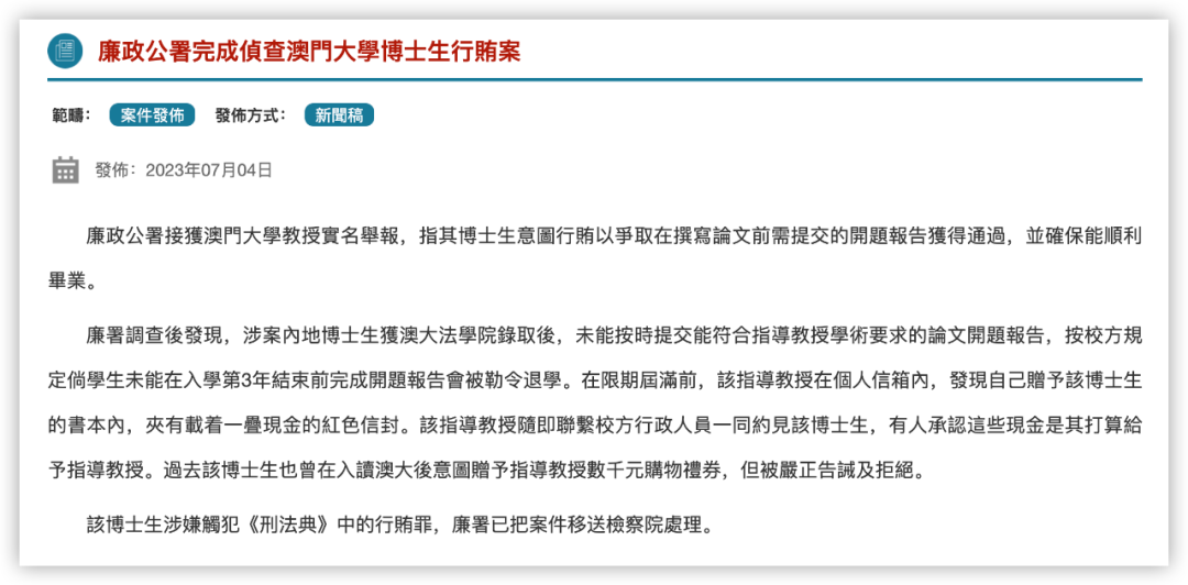 最近中国澳门发生了一起行贿案,具体案情发布在了澳门廉政公署的网站上。