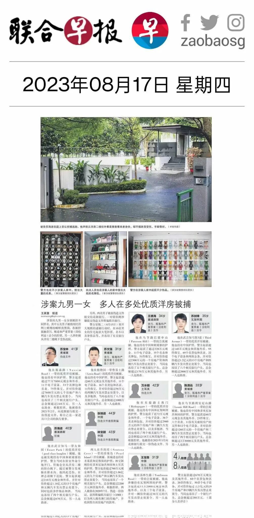 2023年8月15日,新加坡出动了400名警察,进行了全城性的突击搜查。抓获了10名嫌疑人,查获了大约10亿新币的资产,包括豪宅、名车、珠宝、手表以及2300万新元现金。