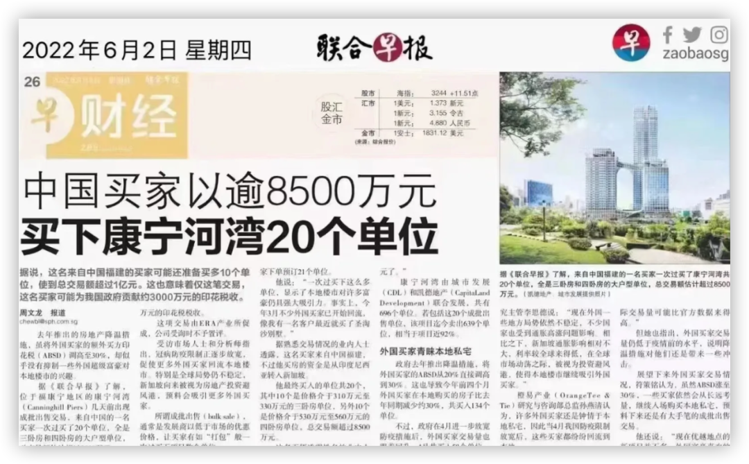 他去年一口气花了1亿新币(含印花税),买下了新加坡康宁河湾的20个单位,全部都是大户型。这件事曾被各国媒体报道,都对这位买家的身份感到非常好奇。