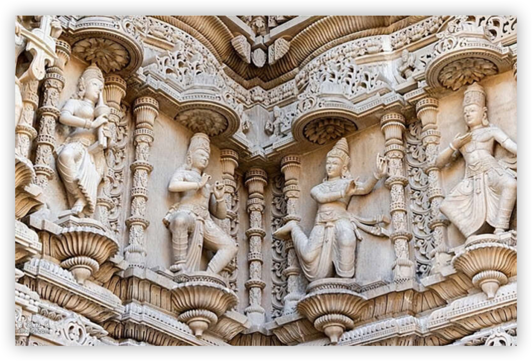 神庙的主体采用的大理石、花岗石和石灰石,都来自欧洲各地,石料被运送到印度。由印度当地的匠人们进行复杂的雕刻之后,再被运到美国,之后再由数万名印度移民志愿者,在工匠的指导下进行组装。