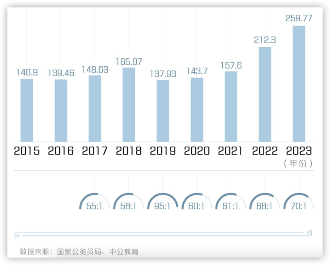 因为就业环境差,体制内的稳定工作就成为了挤破头也要争抢的对象。这些年考公人数的增加就很好说了这一点。2023国家公务员考考试总报名人数已突破250万,相比去年增长了50万人,形成了70个人竞争1个岗位的局面,排名历史第二。