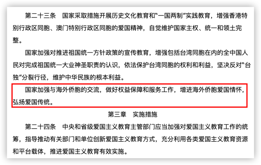 在第二十三条里是这样写的:“国家加强与海外侨胞的交流,做好权益保障和服务工作,增进海外侨胞爱国情怀,弘扬爱国传统。”
