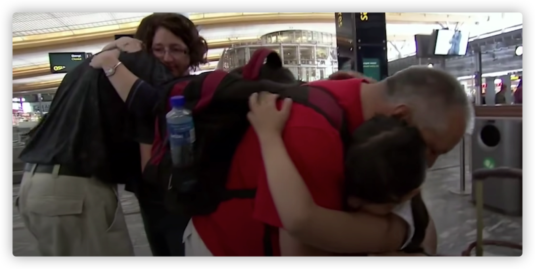 在送别的机场,两家人相互拥抱,依依不舍,两个孩子更是伤心不已,只能将头埋在大人的胸口抽泣。