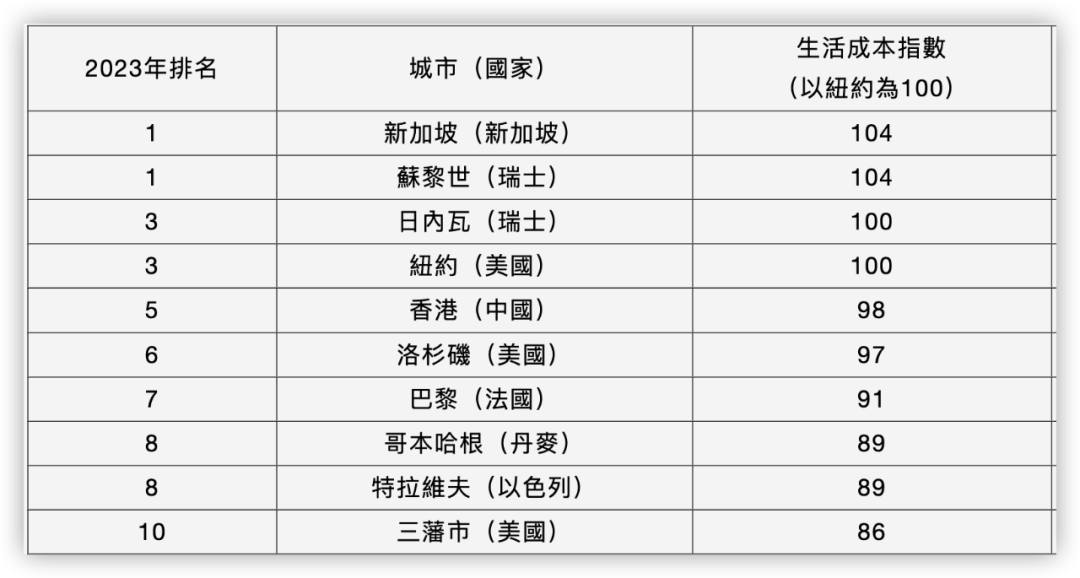 香港的生活成本居高不下。在经济学人今年发布的《2023全球城市生活成本调查》里,香港排名全球第五“贵”。
