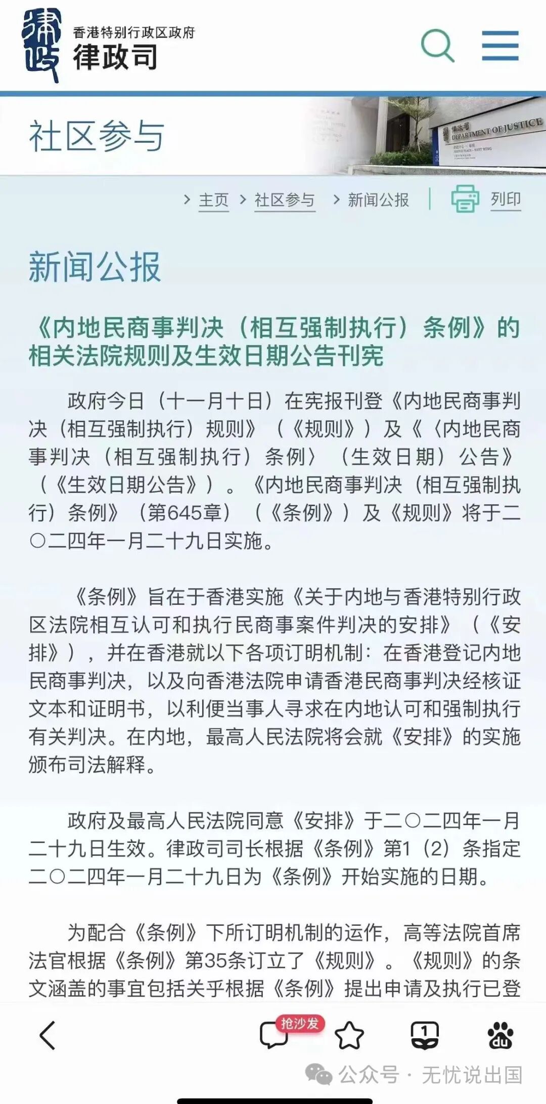 香港与内地的司法互通,将在2024年1月29日正式生效了。这起源于2019年1月18日,内地与香港签署了《关于内地与香港特别行政区法院相互认可和执行民商事案件判决的安排》。