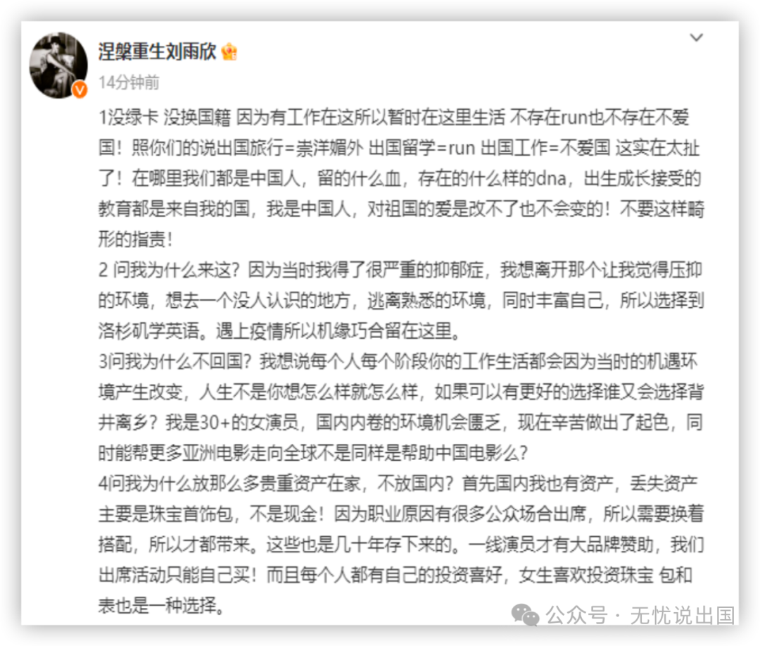 在刘雨欣将自己的遭遇曝光到网上之后,除了对她的同情和对美国治安的吐糟之外,还出现了一种声音,就是质疑她在美国的资产和移民身份。