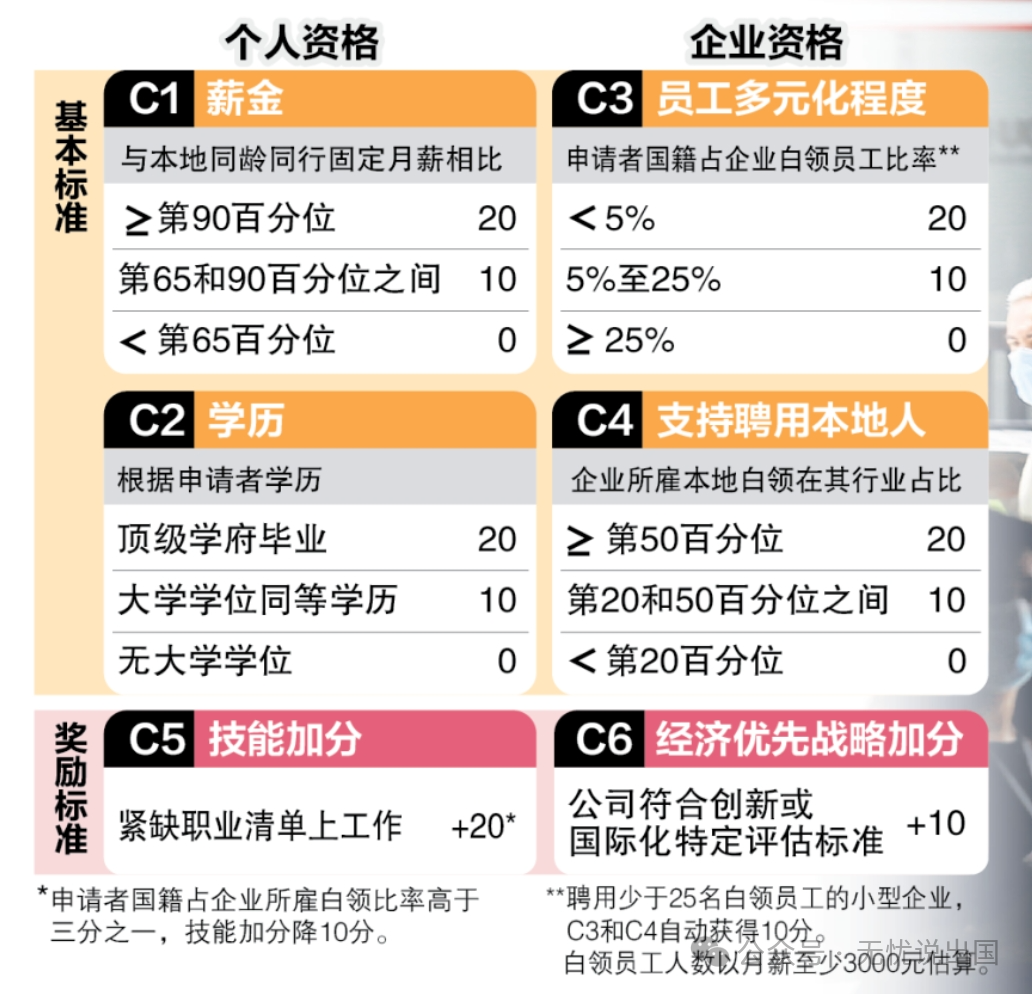 工作签证的薪资要求这两年就涨过一轮,并且还引入了计分制度,想要申请需要在月薪、学历、企业员工多元化及支持聘用本地人等的数项评估中,取得至少40分。申请者的年龄越大,收入要求就越高,例如年龄在40多岁者,最少每月收入要达到1.07万新元(约5.73万人民币)才行。