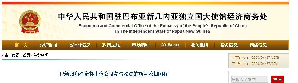 今年4月,中国驻巴布亚新几内亚大使馆的网站上,有这样一条新闻,题目为“巴新政府决定将中资公司参与投资的项目收归国有”。