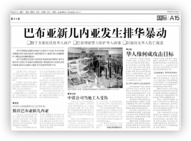 2009年,巴布亚新几内亚爆发抗议活动,抗议者声称商铺应由本地人经营,抗议后来演变为暴力抢劫,数千名当地土人洗劫了多家华人商店,暴徒中还有妇女和小孩。